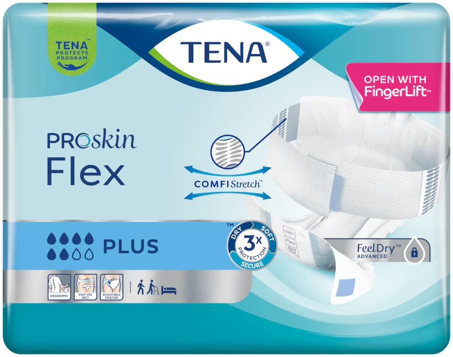TENA ProSkin Flex plenice so primerne za osebe s težko do zelo težko stopnjo inkontinence. Elastični pas s COMFIStretch™ tehnologijo omogoča prileganje plenice različnim oblikam postave, za udobno nošenje in odlično zaščito pred iztekanjem urina. Pas je izdelan iz mehkega in zračnega materiala, zapne se lahko spredaj ali zadaj, kar pomeni da je plenico možno nameščati in menjati v sedečem, ležečem ali stoječem položaju. Pametna oznaka FingerLift™ na pasu olajša iskanje začetka pasu, kar omogoča hitro pripravo plenice za uporabo.